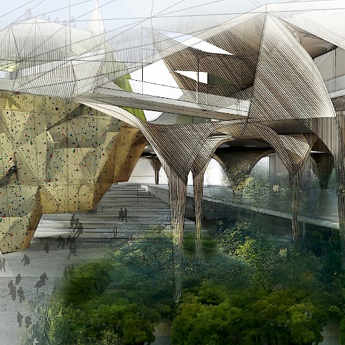 The concept of The Forest is taken through into many aspects of its design, from its construction being predominantly timber, the way indirect sunlight is filtered into the building and gallery through actuated roof lights (like leaves), through to the materiality, and the way that heating could be provided in the cold winter months through the use of biomass boilers using timber from sustainable sources as fuel.