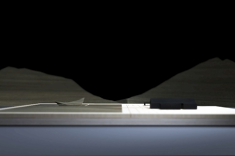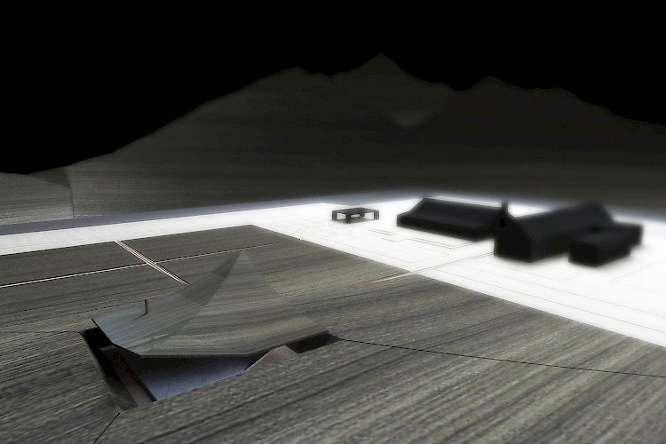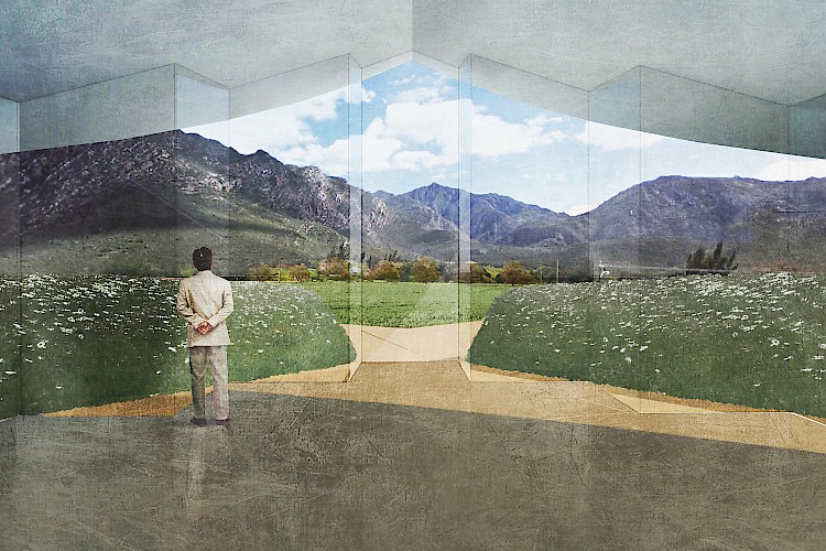 The scale of the building and the user experience of it is kept low and intimate by means of gently sloping the surrounding veld up towards it, disguising its scale, but at the same time ‘purifying’ the view from the inside towards the mountains. The landscape berms surrounding the building is at seated eye leve height, to enforce this intimate relationship with the immediate landscape, the mountains and the sky. A consequence of gently sloping the veld presents the opportunity for a natural open air theatre for imprompto performances.