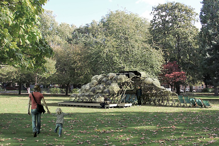 The construction of the pavilion is such that the deck chairs could be loaned from Royal Parks and returned undamaged, or could be bought and sold back to the public once the pavilion is dismantled. It could also be donated if the project is still in budget. Similarly the umbrellas could be bought and sold back to the public. The plastic wire ties are returned for plastic recycling. Therefor no part of the pavilion would be wasted.