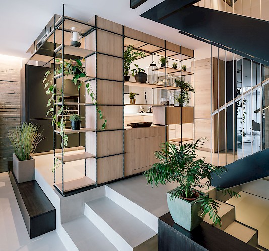 These challenges, and the narrow 6,5m wide site were taken onboard. Most was made to increase the perceived internal scale of the house by maximising ceiling heights where most appreciated and extending the depth of the plan along the linear nature of the site by means of avoiding solid traversal features. Zones are defined with level changes, height changes and screens. The upper bedroom volumes are conceived as a house within a house, which in turn also contributed to the house’s distinct roof shape and its formal definitions overall. These features set this individual house apart from the neighbouring developer driven properties.