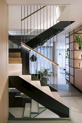 The interior of the house takes it cues from the outside with a limited, balanced, neutral and warm palette.