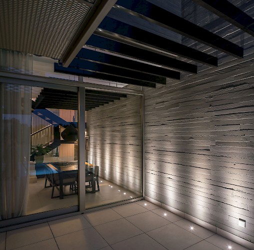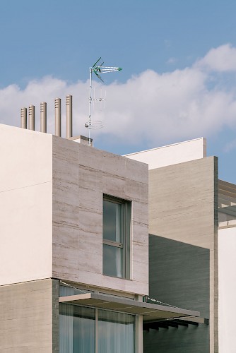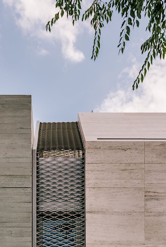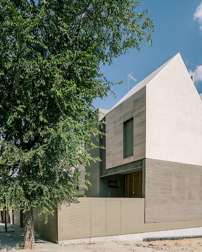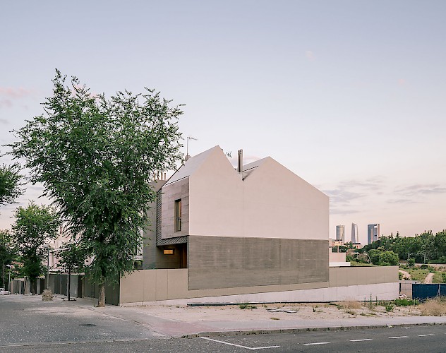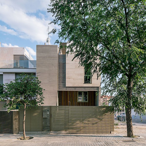 As a townhouse it claims its own space between exposed boarded concrete feature walls, cradling a monolithic 'carved' travertine block. These two contrasting yet complementary materials references some of the materials already nearby, and is also representative of is locality on the edge of Madrid where the urban city (concrete jungle) meets nature (mountains and stone).