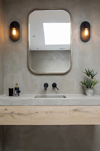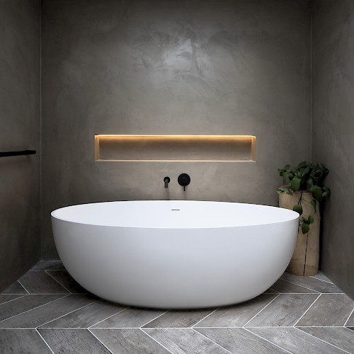 The bathroom extension, while devoid of traditional windows, features a large skylight that offers upward views of the sky from the bath. This design choice not only enhances the bathing experience but also reinforces the connection between the interior and the natural environment, allowing for a serene escape filled with natural light.