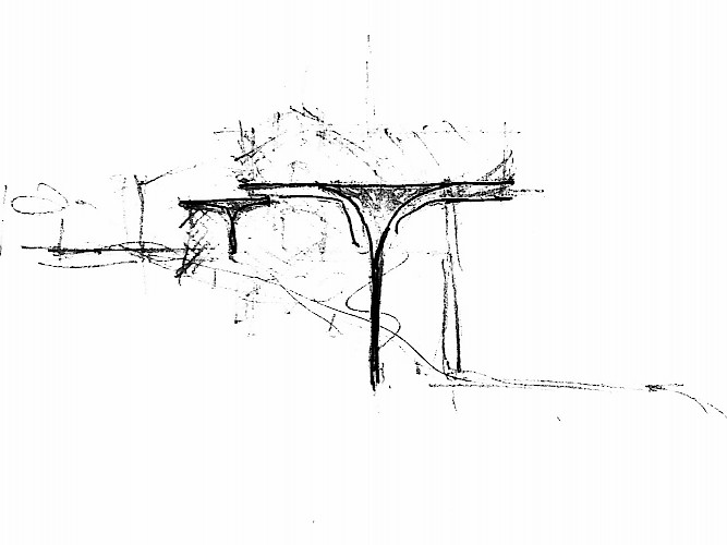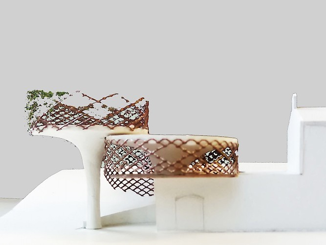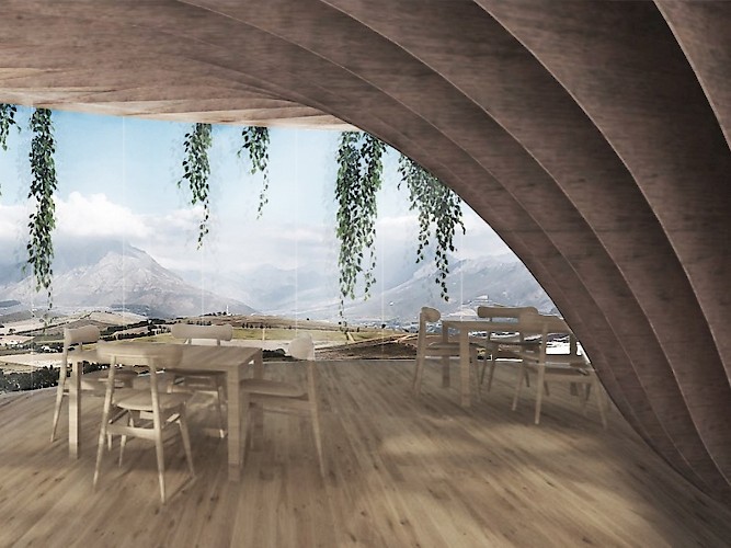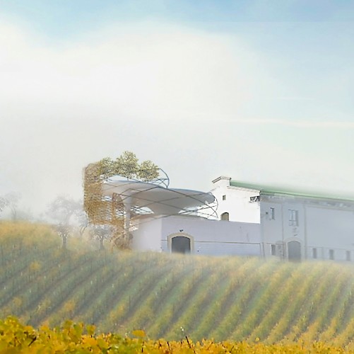 We are planting a family of 'trees' in front of the existing building. The idea to imbedded into the identity of the area and the culture of winery. Simple but sophisticated. The accomdation requirements is broken up into 3 displaced and overlapping circular volumes consisting of dedlicately balanced 'pin-like' structures of various heights. The volumes are ‘wrapped’ in a lattice shell with the aperture size being barely noticeable towards the views, whereas it densifies towards the north side of the building and is planted with vines in order to provide sun protection. This also blends the structure into the landscape, especially when viewed from the upper road. The pattern of the lattice structure also augments the geometries found in the surrounding landscape when looked through.